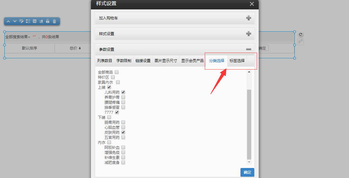 1.在编辑器中,拖入“站内搜索插件”—“产品搜索结果”,点击“样式设置”-“参数设置”,新增“标签选择”、“分类选择”选项,如图所示: